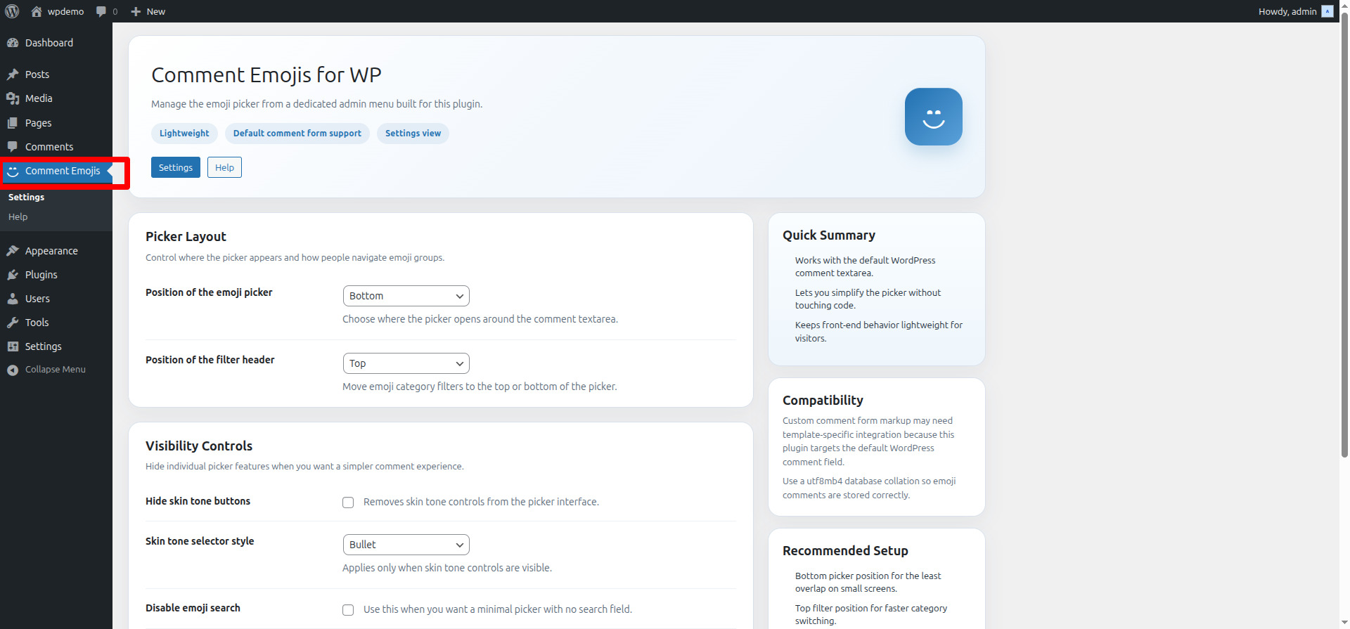 - Go to Settings > Comment Emojis in your WordPress admin dashboard.